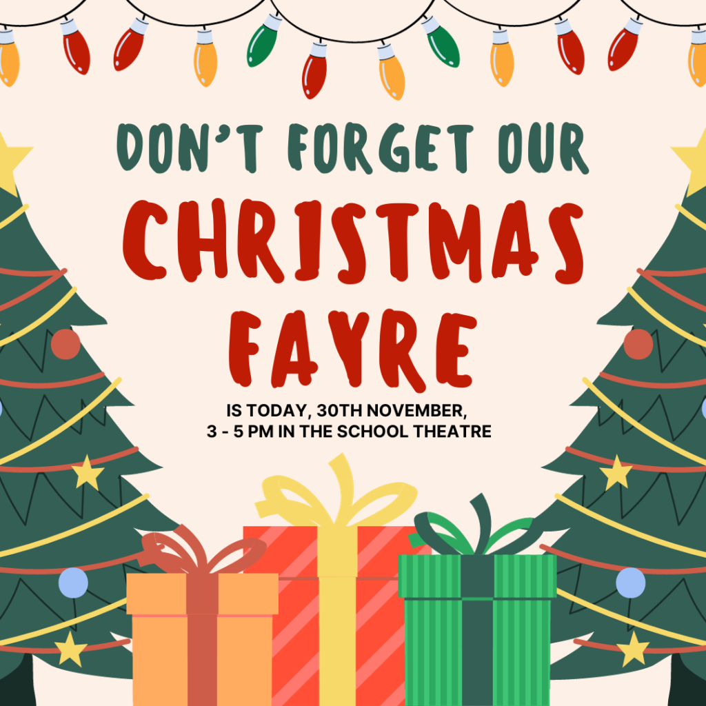 Our Christmas Fayre is this afternoon, from 3pm – 5pm.